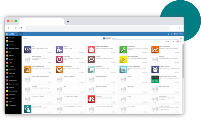 Odoo makes it possible to enable only the options you need for your business by its modular design. The desired modules can be found under "Settings". These can be installed via a simple click. When you install new modules, you have some initial configuration options for some apps during the installation process. For example, the country or account frame and data for the financial year are already queried there for finances.