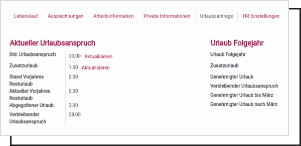 Emma Schneider's vacation entitlement is also visible directly on the contact profile. In the example, the remaining vacation days are 28. These are automatically calculated using the accrual method. (30 entitlement - 3 taken vacation days + 1 additional vacation day).